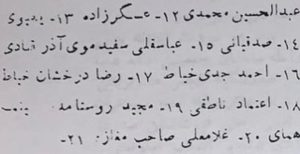 حسن بیرنگ، حاج میرزاعلی شبستری، جعفر پیشهوری، حبیبالله آقازاده [مدیر روزنامه] شاهین، محمدعلی چلبی، غلامرضا بی…، عبداله شکرچی (اصناف) ، تقی بیتاله، غلامحسین فرشی، امین فرشچیان، عبدالحسین محمدی، عسگرزاده، یحیوی ؟، صدقیانی، عباسقلی، سفیدموی آذر قنادی، احمد جدی خیاط، رضا درخشان خیاط، اعتماد ناطقی ، مجید روستا ….همای، غلامعلی صاحب مغازه، …. حسنزاده کفاش، حسن زفیری مدیر [چاپخانه] اطلاعات، محمدتقی رفیعی نظامالدوله، حمید دارانداشی خردهمالک، میررحیم فشنگچی، رضا رسولی، پورعجم …، سعدآبادی صاحب محضر، رحیم فرقان، یوسفی صاحب کارخانه صابونسازی، احمد چمنآرا مدیر کتابخانه چمنآرا، آزاد معمار،