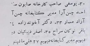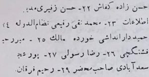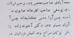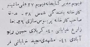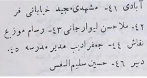 دکتر آخوندزاده، باقر ترکان؟ سراج، اصغر دیباییان د….، دیهیم مدیر کتابخانه دیهیم، علی ماشینچی [صاحب] کارخانه بافندگی شمس، ع… صاحب کارخانه پریموسسازی، ح… زارع خیابانی، کربلایی حسین رن… آبادی، مشهدی مجید خیابانیفر، ملاحسین لیوارجانی، رسام موزع نقاش، جعفر ادیب مدیر مدرسه، … دبیر، حسین سلیمالنفس